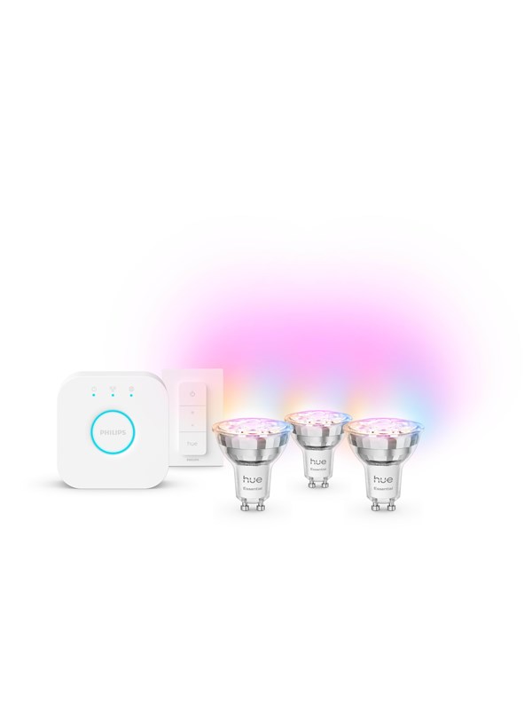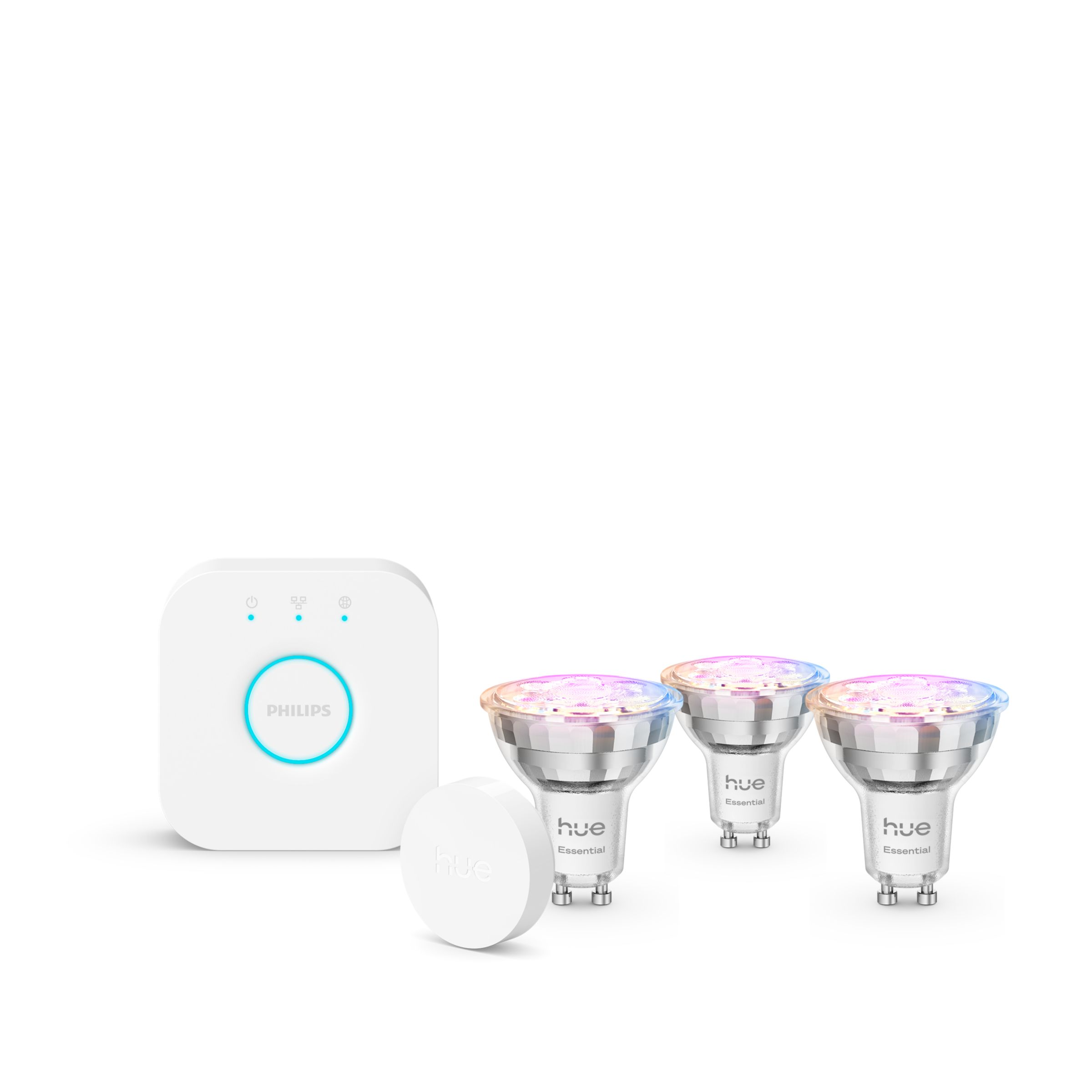 Philips Hue Essential startpaket: Hue Bridge + 3 Essential GU10 + Smart Button, White and Color Ambiance, 2 200–6 500 K, dimbar, Alexa, Google Assistant, Samsung SmartThings, Apple Home