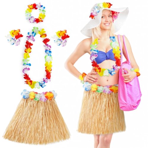 Aomig Hula Hawaiiansk kjol, 5 delar, hawaiiansk blommig kjol, tropisk bandage, Hawaiian blomgirlanger set, 40/60 cm för barn, vuxna, kvinnor sommarfest på tropisk strand, Baldakin, 40