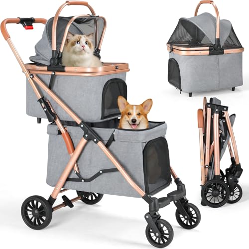 MAMIZO Dubbel hundvagn, hundbuggy upp till 15 kg, vikbar hundvagn i 2 våningar med 4 st slitstarka PU-hjul, hundbur, transportväska, grå