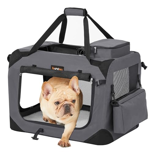Feandrea hopfällbar hundlåda, hundtransportlåda, L, hundväska, Oxford-tyg, mesh, andningsbar, portabel, metallram, med handtag, fickor, 70 x 52 x 52 cm, grå PDC70GY