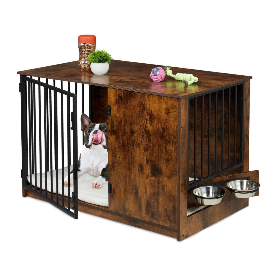 Hundlåda inomhus med skålar – träeffekt, robust design