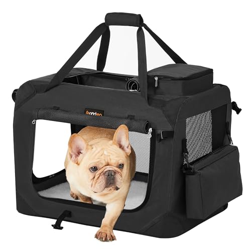 Feandrea hopfällbar hundlåda, hundtransportlåda, M, hundväska, Oxford-tyg, nät, andas, bärbar, metallram, med handtag, fickor, 60 x 42 x 42 cm, svart PDC60H