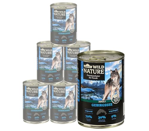 Dehner Wild Nature hundmat bergshav, våtfoder spannmålsfri/sockerfri, för vuxna hundar, lax/kyckling, 6 x 400 g burk (2,4 kg)