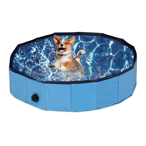 Relaxdays Hundpool, H x D: 30 x 120 cm, vikbar, med dräneringsventil, hundplaskdamm för kylning, PVC & MDF, blå