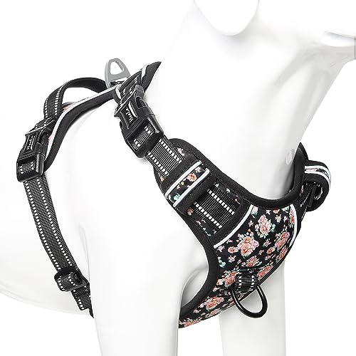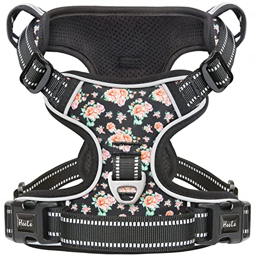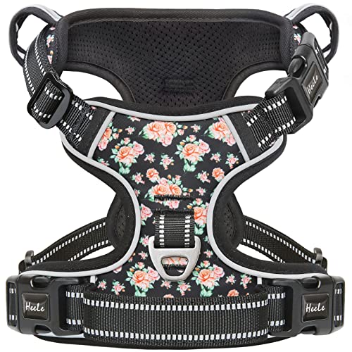 HEELE Hundsele, Hundsele Liten Små Medelstora Stor Hund, Andningsbar, Justerbar, Vadderat Handtag, 3 Spännen, Reflekterande Mjuk och Skön Hundsele, Antidragselar, Hundsele Antidrag, Blommig Svart, L