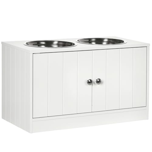 PawHut hundskålar, upphöjd foderstation med 2 skålar i rostfritt stål, hundskål med 44 l förvaringsutrymme, magnetdörrar, ätskål, vattenskål för stora hundar, vit