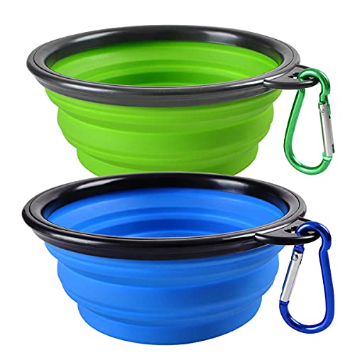 2 stycken hundskålar vikbar reseskål, bärbar läckagesäker hundskål med karbinhakar, silikon matskål för katter, hundar och husdjur för vatten och foder (blå + grön, 350 ml)