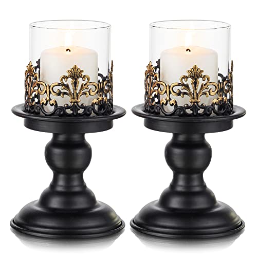 Sziqiqi Black Shabby Chic Pillar Ljushållare Set för bord - Gotisk Ljusstake Hållare Rustik Glas Hurricane Ljushållare Mittstycken för Mantlepiece Öppen spis Middag Skrivbord Bordsskiva Ornament