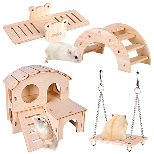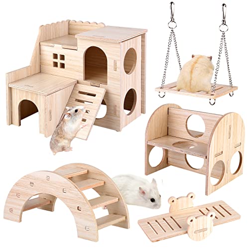 Vegena 5 stycken hamsterleksaker i trä, gör-det-själv-hamsterleksak, hamstergömställe, hus, bro, gunga, träningsleksaker, hamstertillbehör för bur för ökenråttor, råttor och dvärghamstrar