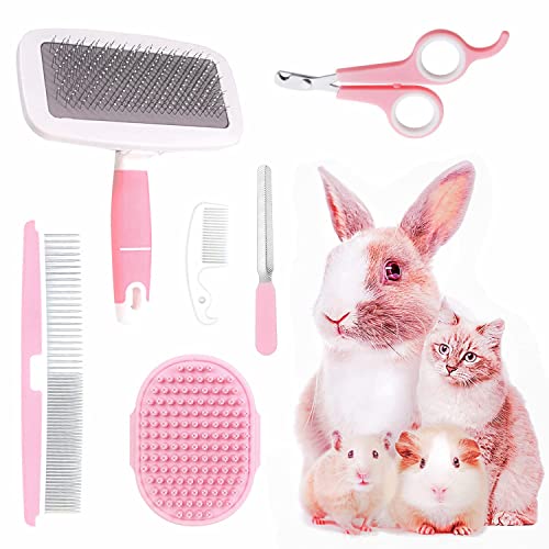 Crafterlife Kit för små djur husdjur skötsel, husdjursfällande slickerborste, badmassagehandske, husdjursskötselkam, nagelklippare trimmer kanin, valp, kattunge, marsvin, hamster, iller (rosa), 6 st
