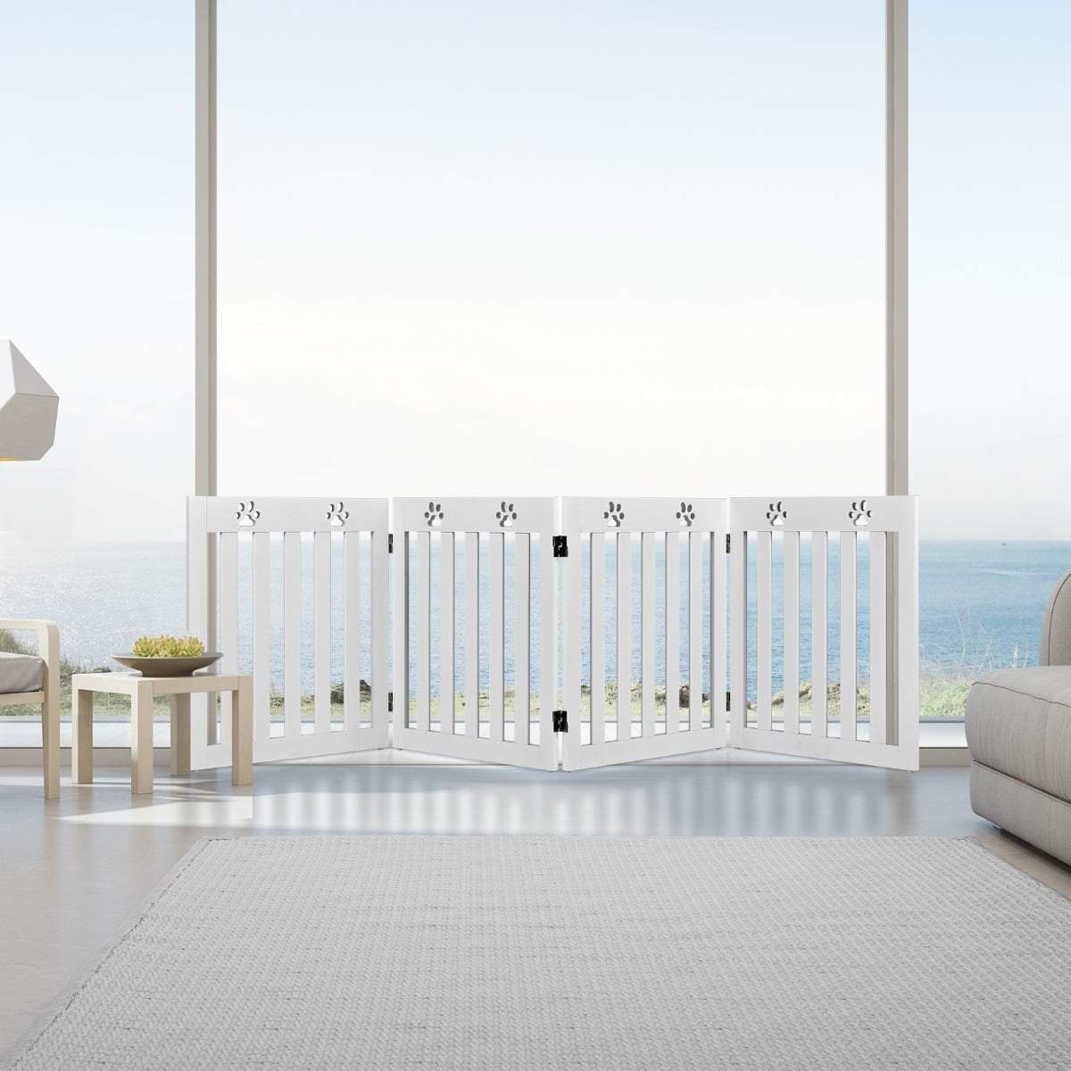 PETMAKER Husdjursgrind – 4-panels inomhus hopfällbart hundstaket för trappor, hallar eller dörröppningar – 182 x 61 cm infällbar trä fristående hundgrindar (vit)