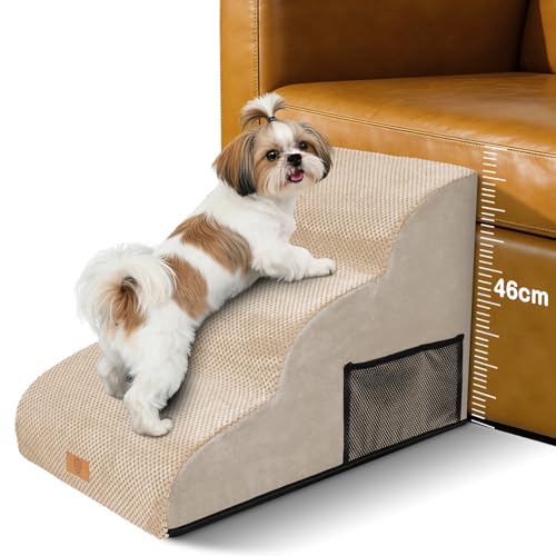 COZY KISS hundtrappa för små hundar 40 cm, husdjurstrappa för soffa av hög densitet svamp, hundtrappa hundramp med tvättbart överdrag och halkfritt golv, 40 x 57 x 40 cm, 3 steg, ljusbrun