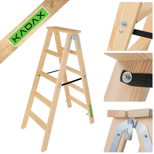 KADAX Hopfällbar trästege, ståstege i 5 steg med stålkrok, bockstege för målningsarbeten, hushållsstege