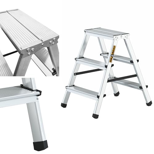 Drabest 3-Stegs Aluminium Dubbelsidig Hushållsstege 125kg Kapacitet - Stegstege med Arbetsstegeplattform – Stegar Multifunktion – Stegsteg 3 Steg – 41 X 63 X 16 Cm