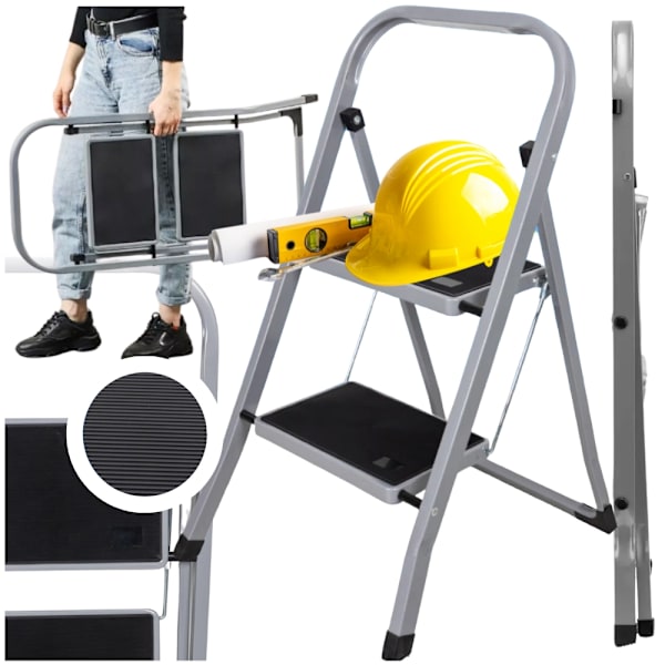 2-trinns fällbar hushållsstege av stål och metall, grå, 150 kg