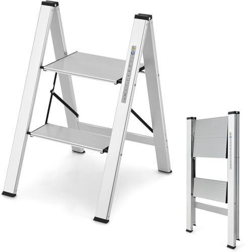 KINGRACK Trappstege med 2 steg, vikbar stege i aluminium, bärbar smal köksstege, säker hushållsstege, trappstege med multifunktion, silver