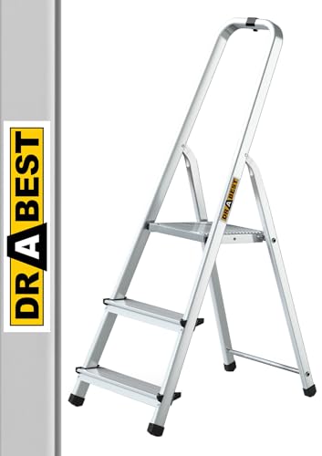 Drabest Aluminium 3-Stegs Hushållsstege 125kg Kapacitet - Stegstege med Säkerhetsskena & Arbetsstegeplattform – Stegar Multifunktion – Stegstegar 3 Steg – 40 X 121 X 12 Cm