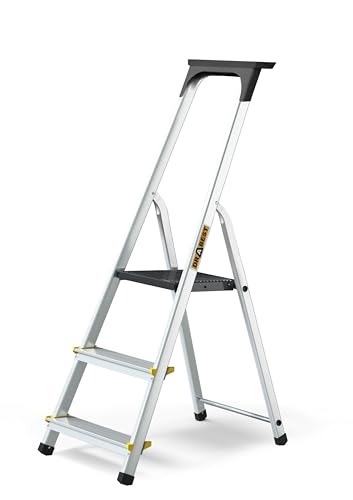 Drabest STEGAR I PRO-SERIEN Aluminiumtrappstege 3-Stegs Hushållsstege 150kg - Aluminiumtrappstege med Halkfria Fötter & Arbetsstegeplattform – Multifunktionsstegar – 40 X 121 X 12 Cm