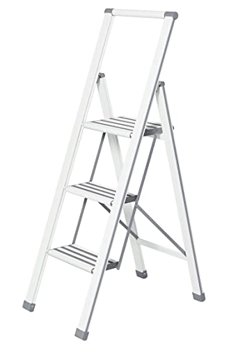 WENKO Aluminiumdesign hopfällbar trappstege 3-stegs hushållsstege, belagd, vit/grå, 5,5 x 44 x 127 cm