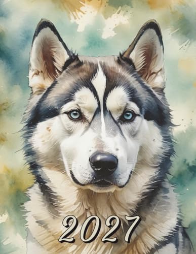 2027: Large Monthly Calendar Planner – Watercolor Siberian Husky Dog