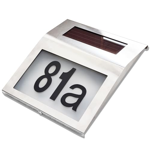 Hopelit upplyst husnummer, husnummer belyst sol med 2 LED för utomhusbruk, rostfritt stål solhusnummer med IP65 vattentät och skymningsbrytare, nummer 0–9 och bokstäver a-h