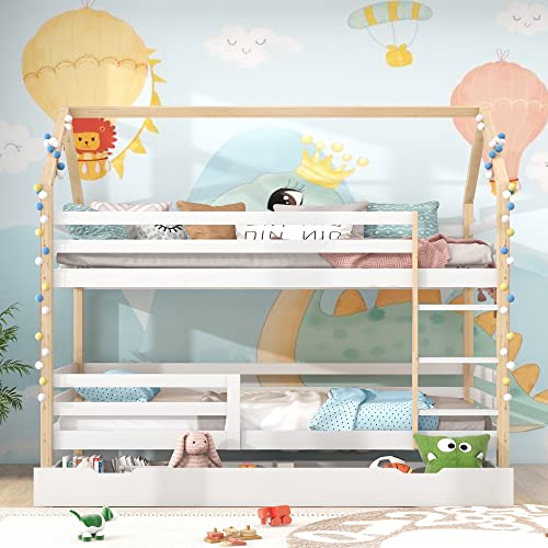 Aunvla Barnsäng, hussäng med lådor, massivt trä med ribbotten, furu, hussäng, barn och ungdomsrum, vit + träfärg (90 x 200 cm)
