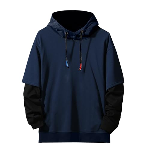 GURUNVANI Mode huvtröjor herr färgblock pullover rund hals huvtröja sweatshirt lapptäcke, marinblå, L