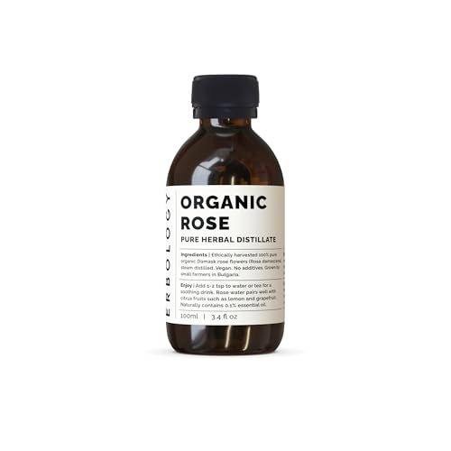 Erbology Ekologiskt rosvatten 100 ml – destillerat från damastros – premium hydrolat av livsmedelskvalitet – lugnar, återfuktar och lugnar – icke-GMO – återvinningsbar glasflaska