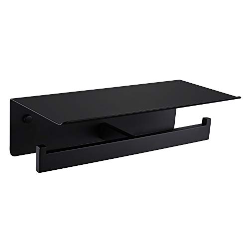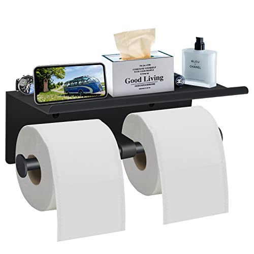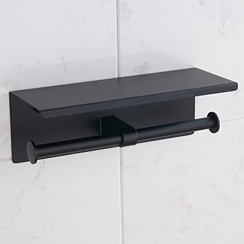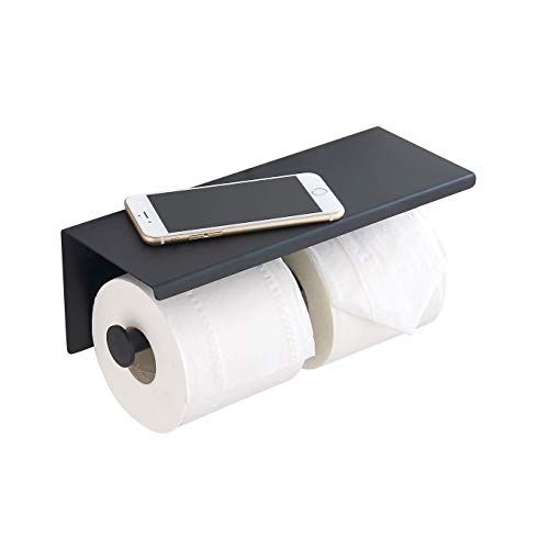 Dubbel toalettpappershållare med hylla matt svart, APLusee SUS304 rostfritt stål modernt badrum näsduksrulle hållare mobiltelefon förvaringsställ