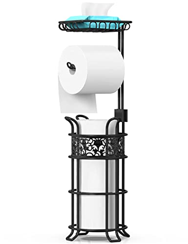 Toalettpappershållare stativ med hylla, fristående toalettpappersrulledispenser rymmer 3 stora rullar jumbo megapapper, för husbil, badrum, blommönster, svart