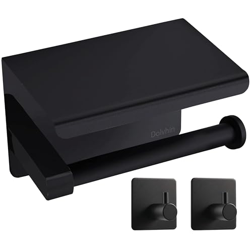 Dolvhin Toalettpappershållare utan borrning inkl. 2 handdukskrokar | Toalettpappershållare med hylla | Klorrullhållare självhäftande rostfritt stål | Toalettpappershållare badrum | matt svart
