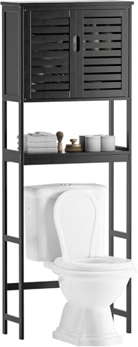 SMIBUY Badrum över toalettförvaringsskåpet, 2-dörrars bambuskåporganisatör, fristående utrymmesbesparande toalettställ med justerbar invändig hylla och öppen hylla (svart)
