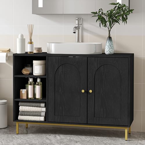 Hzuaneri Badrumsskåp, Under Handfat, Handfatsskåp med Öppen Hylla och 2 Dörrar, Justerbar Hylla, Fristående, för Badrum, Svart 30 x 90 x 63 cm BC09804G
