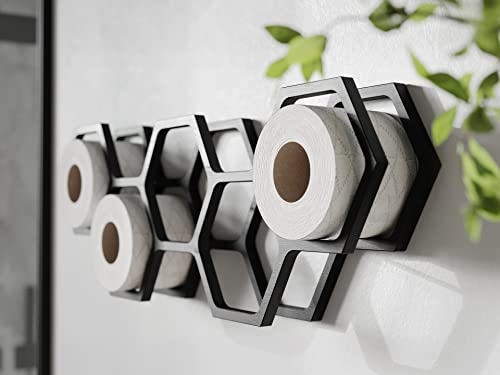 Toalettpappershållare, hylla av trä till badrum, väggmonterad förvaring för toalettrullar, handgjord modern hexagondesign (svart)