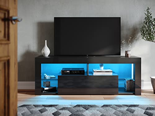 SONNI TV-skåp, TV-bräda svart, med LED-belysning, TV-bord, högglans, lågbord med glashylla, vikdörr, handtaglös, skänk, TV-hylla för TV upp till 65 tum, 140 x 35 x 50,5 cm.