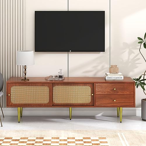 Modern stil TV-bänk med 2 plastrottingskjutdörrar och 2 lådor, snyggt TV-stativ med rörligt laminat, TV-bord, TV-hylla för vardagsrum, för TV upp till 70 tum (valnöt), HNDE307067068