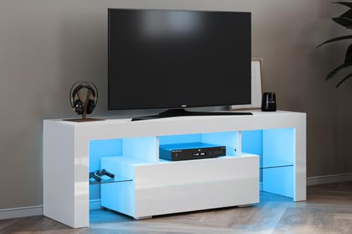 SONNI TV-bräda, vit, grepplös design, TV-skåp, högglansigt TV-bord med LED-belysning, TV-hylla för TV-apparater upp till 65 tum, 130 x 35 x 45 cm., GTV005-3