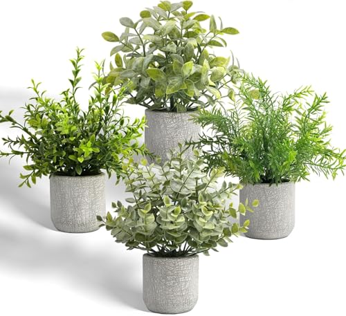 GreenCallow konstgjorda växter för heminredning inomhus. 4 miniväxter, rosmarin fuskväxtdekor, eukalyptusväxt, gräsväxter. Liten falsk hylla eller skrivbord grönska inredning