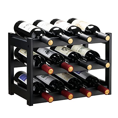 VASMIA Bambu Vinhylla, Stabil och Hållbar Vinförvaring Skåp Hylla, Vinhyllor Bänkskiva för Förråd, Kök, 3-Våningar 12 Flaskor Vinhylla, Natur