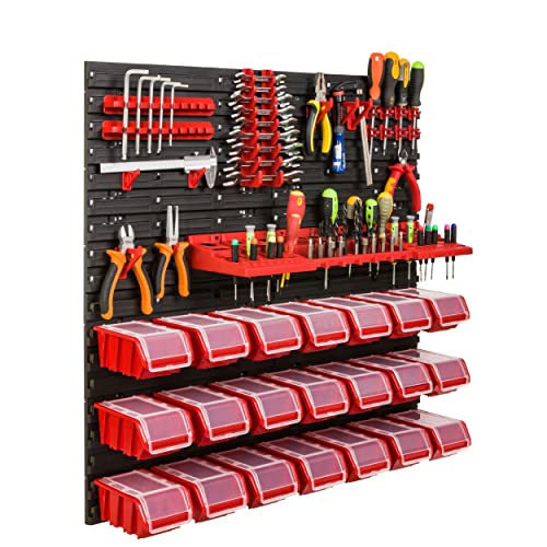 Lagersystem verkstadshylla | 78 x 78 cm | 21 st. Box | Vägghylla med verktygshållare och stapelbara lådor – väggplattor extra stark bulkhylla, vertygshålvägg, förvaringshylla, garage, hylla (1)