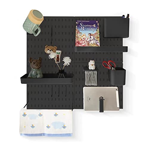Pegboard kombinationssats med hylla och krokar, ingen stansning för garage kök vardagsrum badrum 56 cm x 56 cm, väggorganiserare med Pegboard (svart, 4)