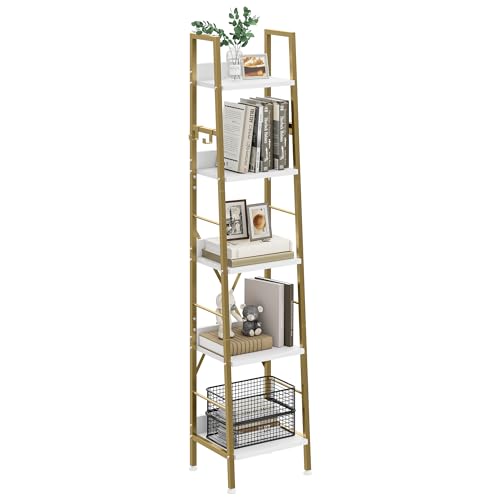 YITAHOME Bokhylla med 5 nivåer, industriell steghylla, fristående bokhylla, trähyllor och metallram, bokhylla, modern hylla för vardagsrum, hall, kontor, gyllene bokhylla
