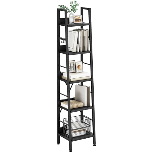 YITAHOME Bokhylla med 5 nivåer, industriell steghylla, fristående bokhylla, trähyllor och metallram, bokhylla, modern hylla för vardagsrum, hall, kontor, svart bokhylla