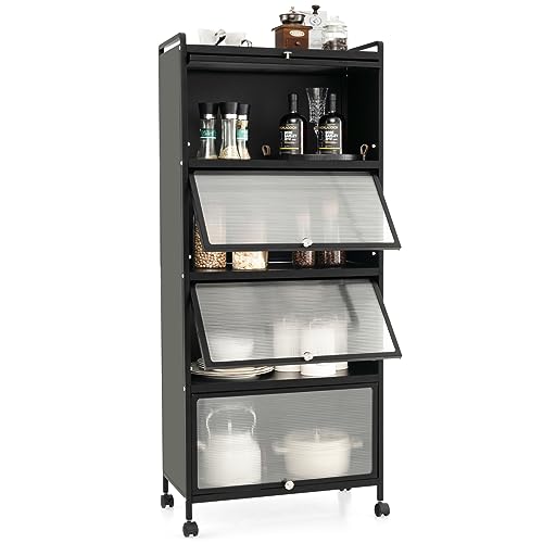 COSTWAY Köksskåp högt, kökshylla med hjul, 5 nivåer, mikrovågsstativ med hopfällbara PC-dörrar och tippskydd, stående hylla, högskåp, för kök matsal vardagsrum (svart)