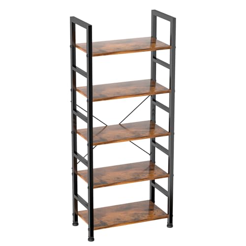 Sweetcrispy Bokhylla i 5 nivåer, stående hylla med stålram, lagerhylla i industriell stil, hyllor i vardagsrum kök, smal hylla för kontor, sovrum, arbetsrum, modern brun, 60 x 31 x 160 cm