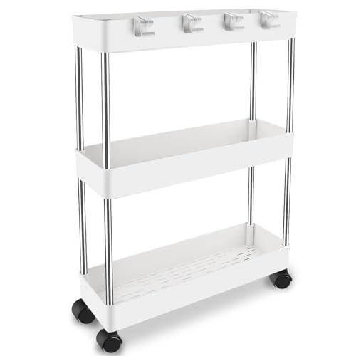 Zosenyer Rullvagn, 3 nivåer hylla köksvagn, hantverkvagn på hjul för kök, kontor, badrum, kosmetisk vagn, badrumshylla smal 13 cm, med 6 krokar liten nischvagn, vit