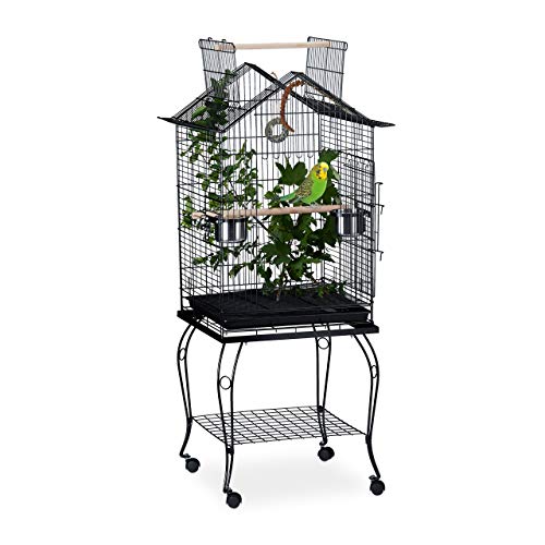 Relaxdays Fågelvoljär med frisäte, hylla, på hjul, XXL fågelbur, böjda fötter, HBT 140 x 62 x 59 cm, svart