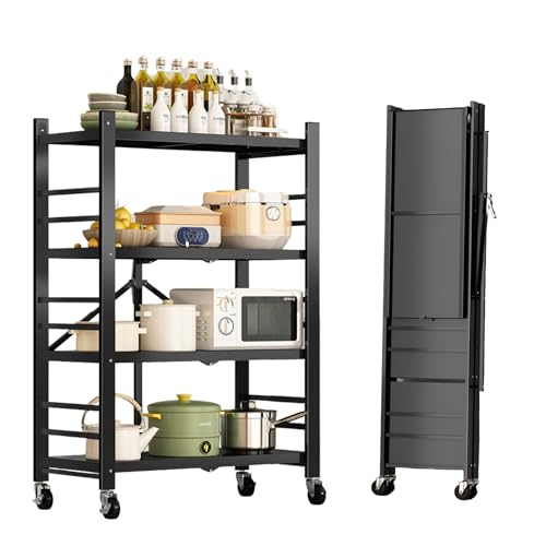 BRIAN & DANY Fällbar hylla med hjul, 4 våningar, vikbar kraftig hylla, metallhylla, svart, förvaringshylla, hopfällbar hylla för köket, kontoret, 71 x 36 x 127 cm