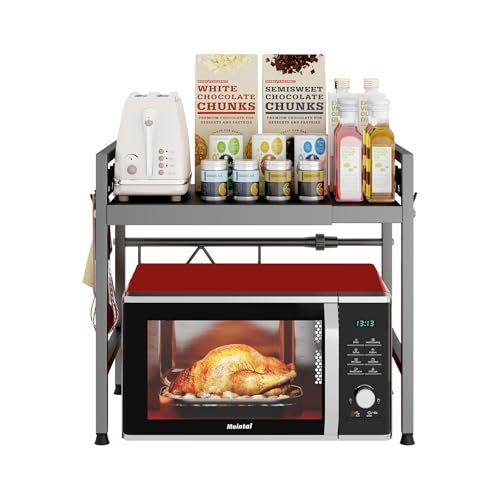 Mointal Justerbar Kökshylla för MikrovåGshylla, 2-Nivåer Expanderbar Hylla för Mikrovågsugn i Köksbänkskiva, MikrovåGshåLlare I KolståL, Ställ För Luftfritös med 8 Krokar, Grå