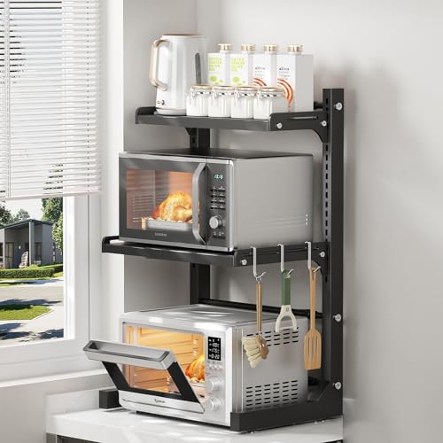 ABCOOL Upphöjd infällbar köksbagare mikrovågsugn ställ, 3-nivåer expanderbar och justerbar höjd kolstål hylla bänk med 3 klämkrokar, elektrisk ugnshållare